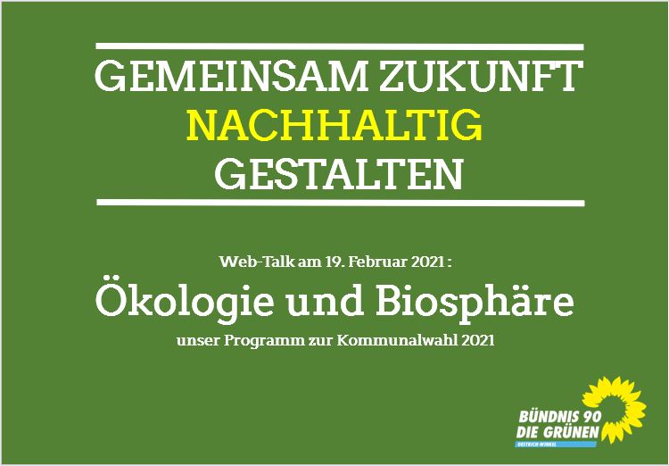 Die GRÜNEN laden alle interessierten Bürgerinnen und Bürger zum Gespräch über diese zentrale Zukunftsaufgabe ein. Es ist ganz einfach: Wählen Sie sich unter meet.jit.si/GRUENE-OeWi-Web-Talks ein und diskutieren sie mit! Ihre Meinung interessiert uns, denn auch die lebendige Kommune ist quasi ein Ökosystem und hier zählt auch die Vielfalt!