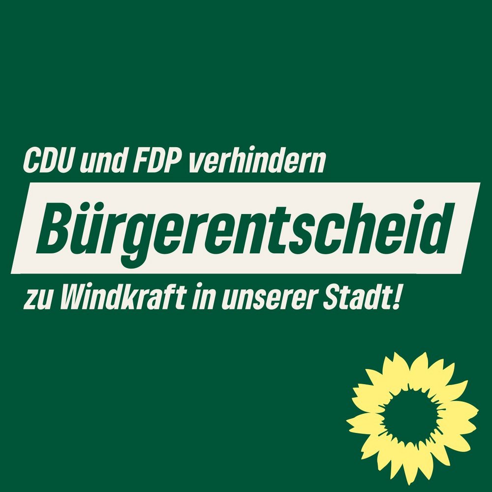 Gleichzeitig erkennen die GRÜNEN an, dass es sich beim Thema Windkraft um kein einfaches politisches Thema handelt. Bei einer solchen entscheidenden Zukunftsfrage sollen alle Bürgerinnen und Bürger die Möglichkeit haben ihren Beitrag zur Entscheidung zu leisten. Ein Bürgerentscheid ist immer das Mittel, um politische Entscheidungen mit der größtmöglichen Legitimation zu bestätigen. Es ist zu vermuten, dass CDU und FDP Angst vor dem Ausgang des Bürgerentscheides haben und sich deswegen gegen das Vorhaben stellen wollen.