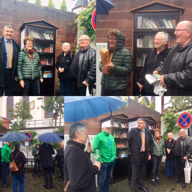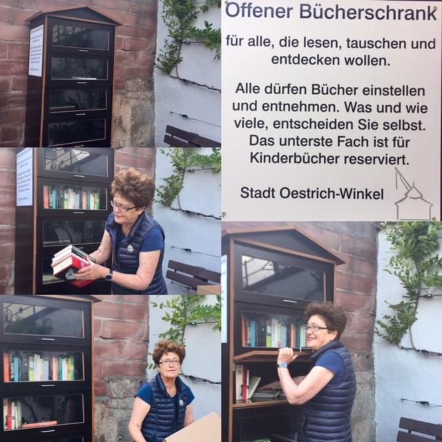 Endlich ist es soweit! Claudia Burgsmüller (GRÜNES Ortsbeiratsmitglied von Winkel) befüllt den offenen Bücherstand. Die offizielle Eröffnung fand anschließend am Mittwoch, 08.05. 2019 um 17:30 Uhr im Beisein von Bürgermeister Michael Heil, 1. Stadtrat Werner Fladung, Ortsvorsteher Erich Herbst, Stadtverordneter Gerda Müller und allen Interessierten statt.